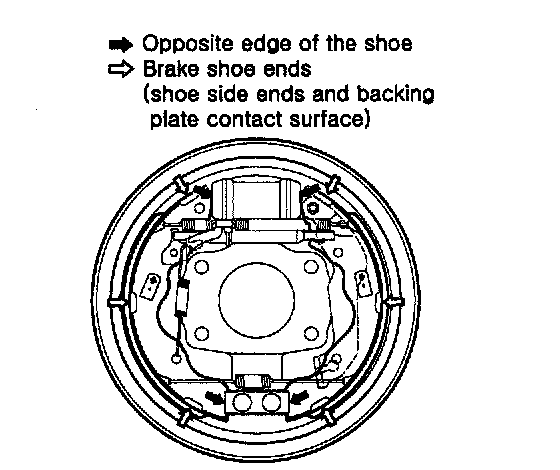 9. Apply brake cylinder grease or equivalent rubber grease to the brake shoe ends and opposite edges of the shoes shown. Don't get grease on the brake linings.