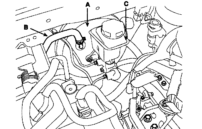 1. Disconnect the vacuum hose (B) from the brake booster (A).