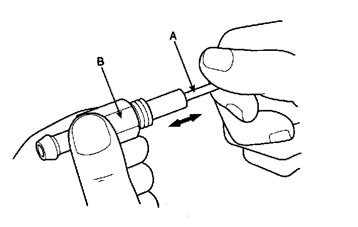 2. Insert a thin stick (A) into the PCV valve (B) from the threaded side to check that the plunger moves.