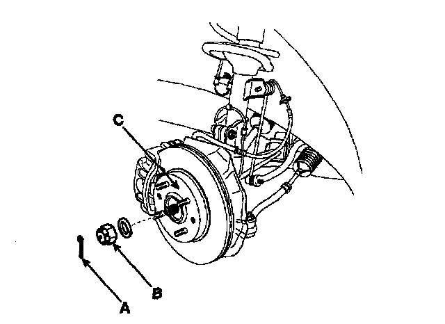 2. While applying the brakes, remove the split pin (A), then remove the locknut (B) and washer from the front hub (C).