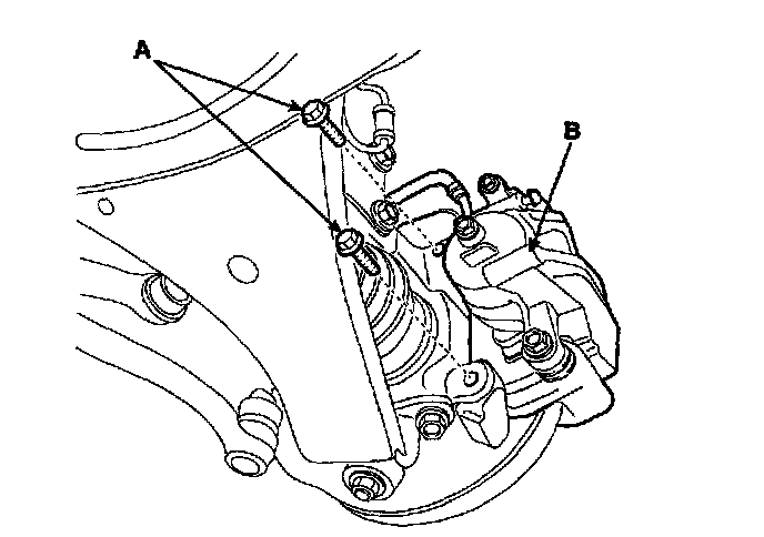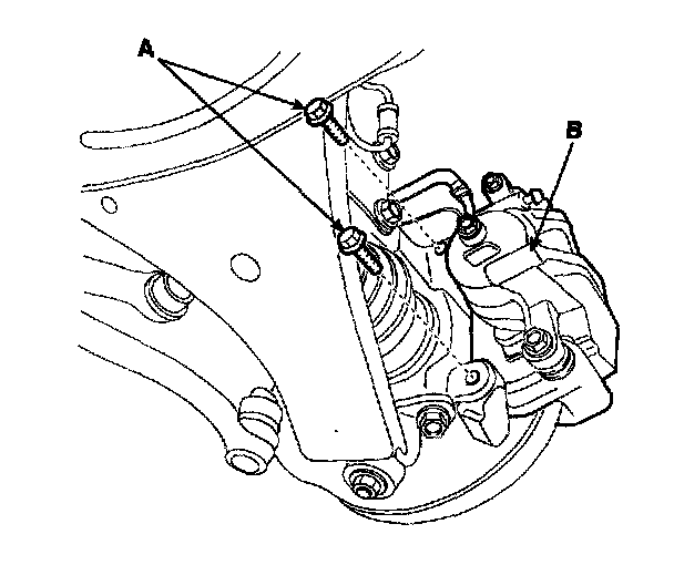 5. Install the brake caliper assembly (A) to the knuckle (B).