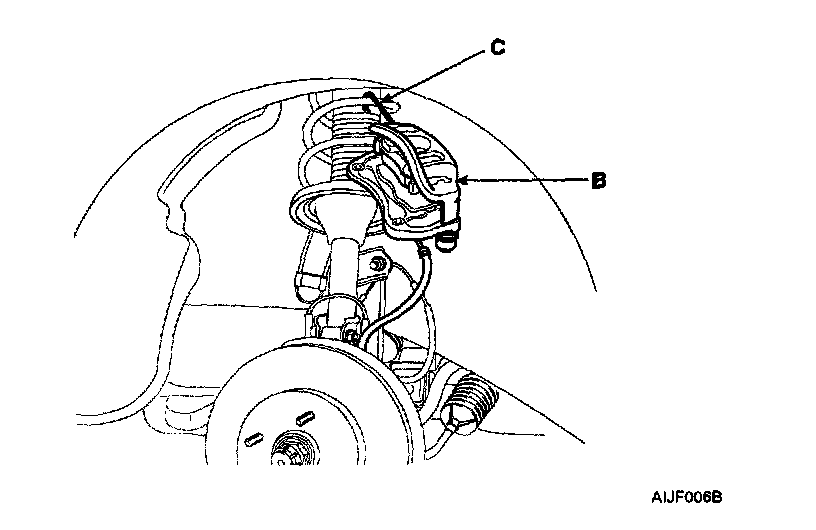 3. Remove the caliper (A) from the knuckle (B) and hang the caliper (A) on the front damper (C) with wire (D).