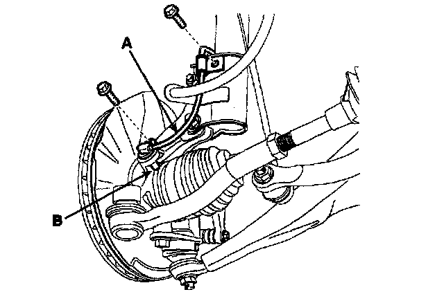 4. Install the wheel speed sensor (A) to the knuckle (B).