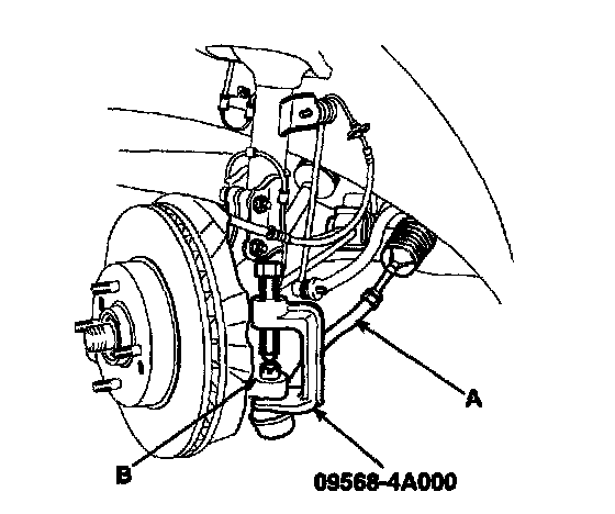 c. Disconnect the ball joint (A) from knuckle (B) using the special tool (09568-34000).