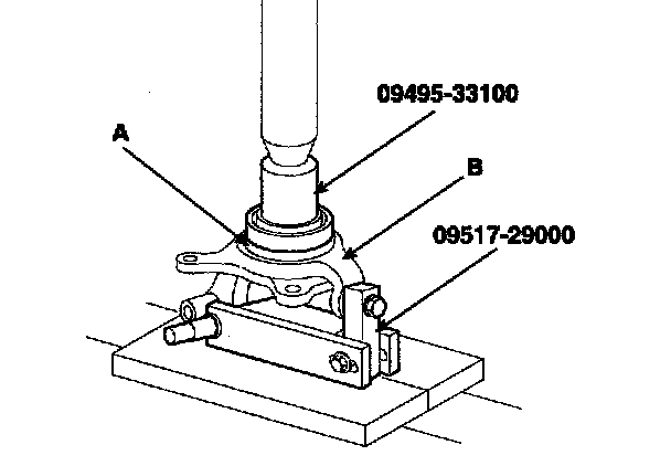 7. Using the special tools (09495-33100, 09517-29000), remove the wheel bearing outer race (A) from the knuckle (B).