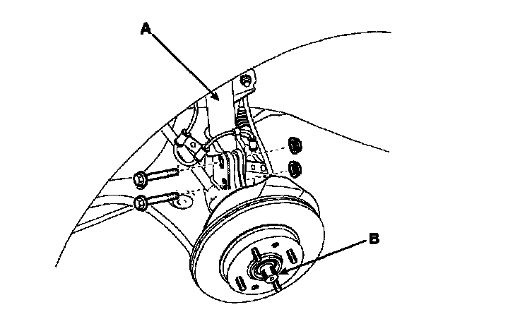 2. Install the strut assembly (A) and the drive shaft (B) in the knuckle.