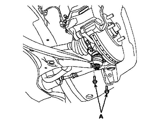 6. Remove the lower arm mounting bolts (A) from the knuckle.