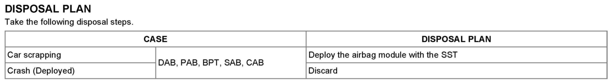 AIRBAG MODULE DISPOSAL PROCEDURESBefore disposing of a vehicle equipped with an airbag, or prior to disposing of the airbag module, be sure to first follow the procedures to deploy the airbag.