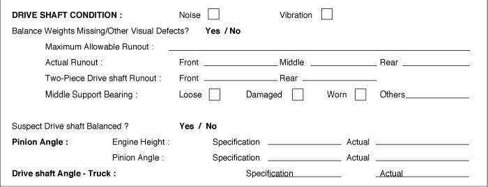 To assist the service adviser and the technician, check the drive shaft condition with the questions listed below by filling them.