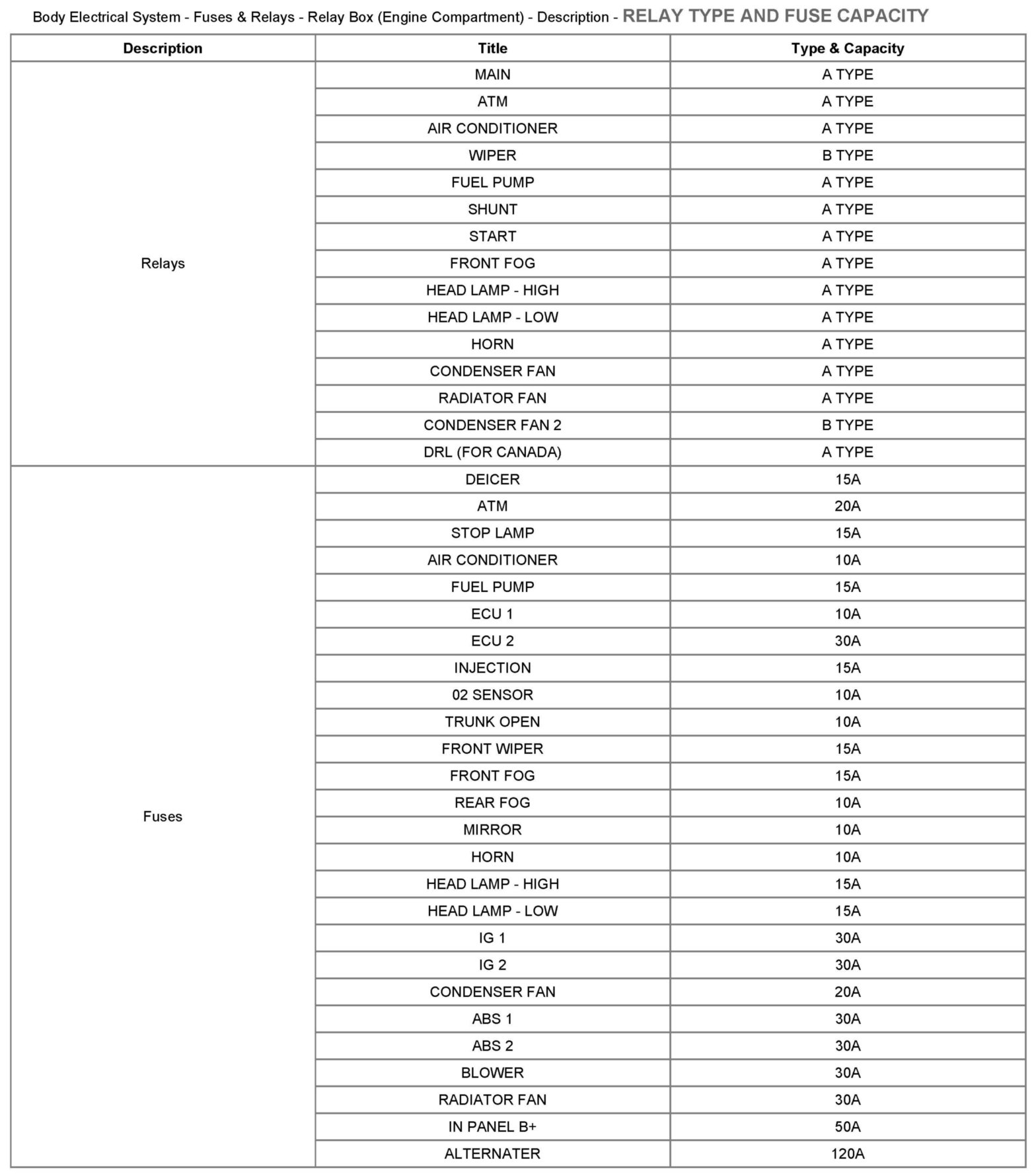 Relay Type And Fuse Capacity: