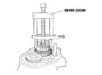 10. Remove the fifth synchronizer hub, the ring with fifth speed gear and the needle roller bearing using the special tool(09495-33000).