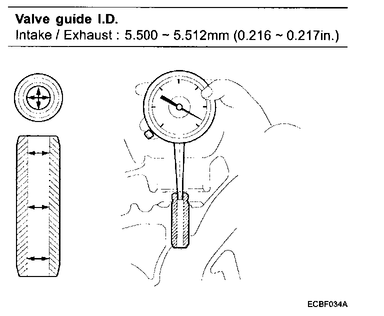 1) Using a caliper gauge, measure the inside diameter of the valve guide.