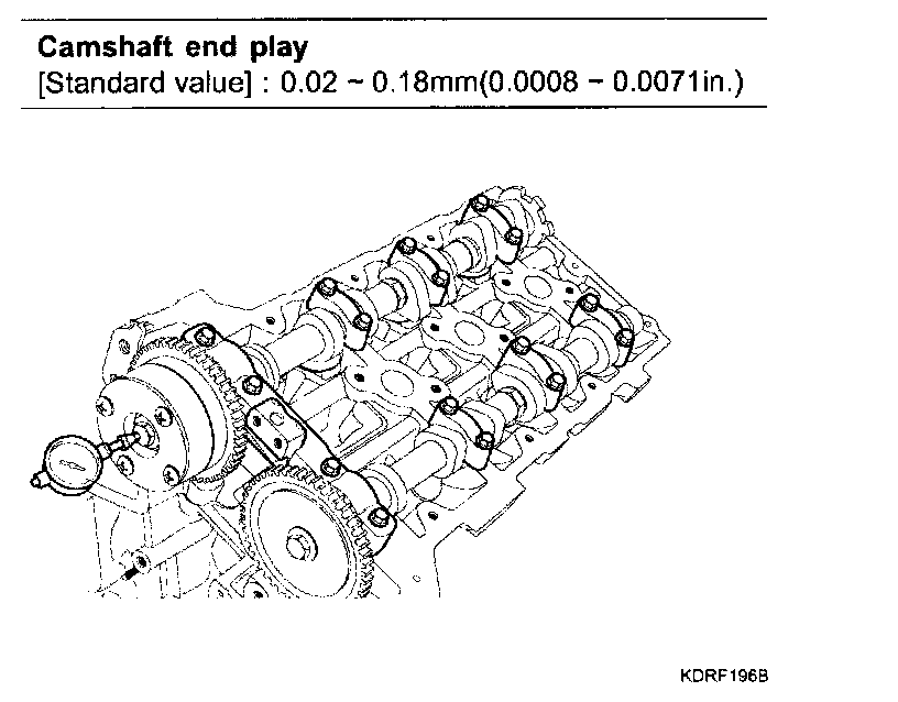 2) Using a dial indicator, measure the end play while moving the camshaft back and forth.