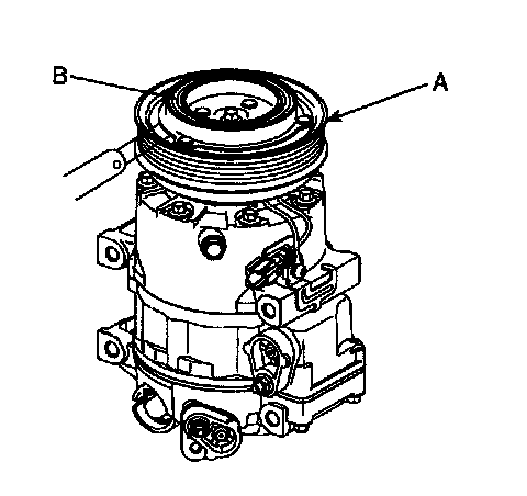3. Measure the clearance between the pulley (B) and the disc & hub assembly (A) all the way around. If the clearance is not within specified limits, remove the disc & hub assembly and add or remove shim (gap washer) as needed to increase or decrease clearance.