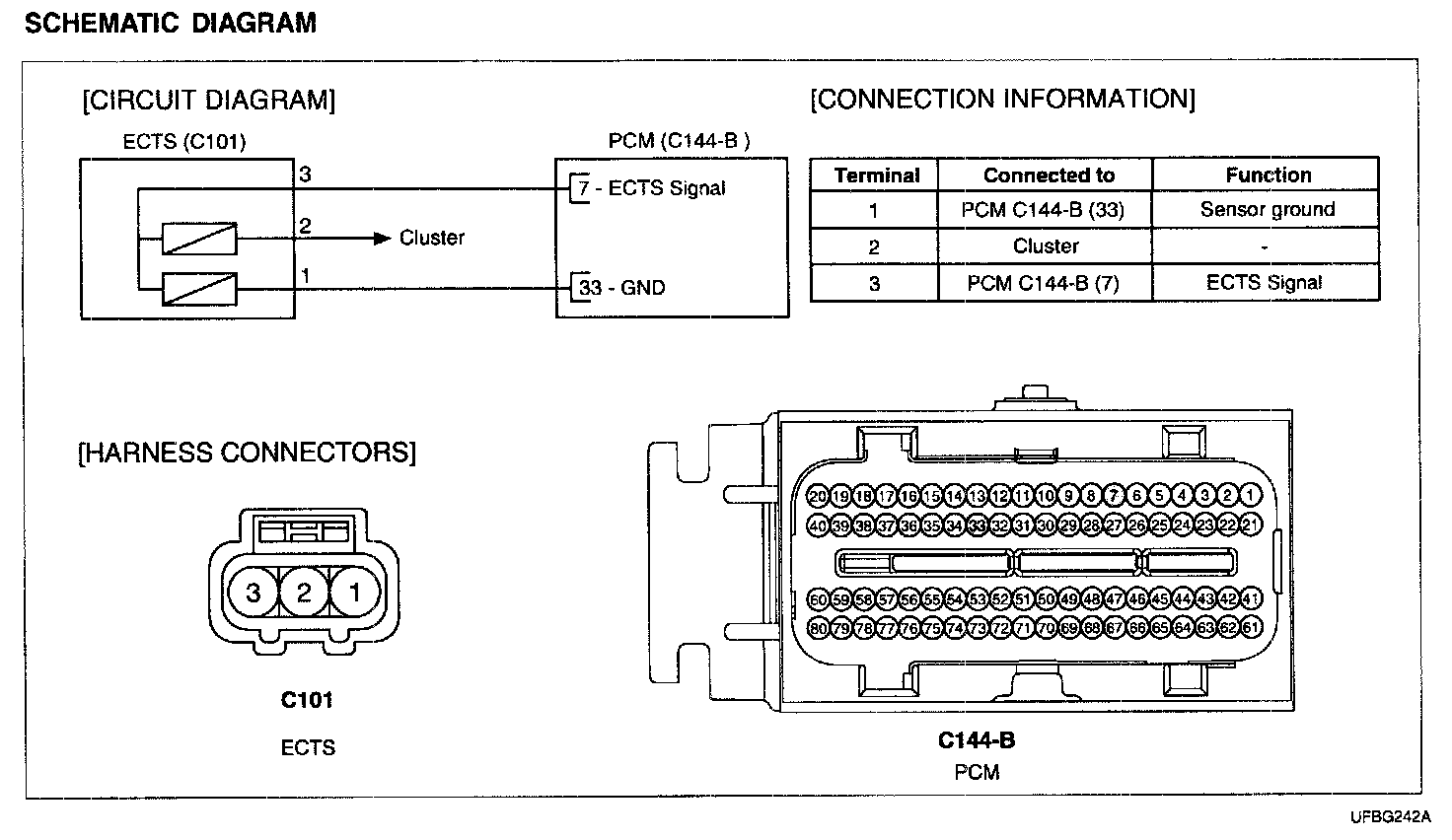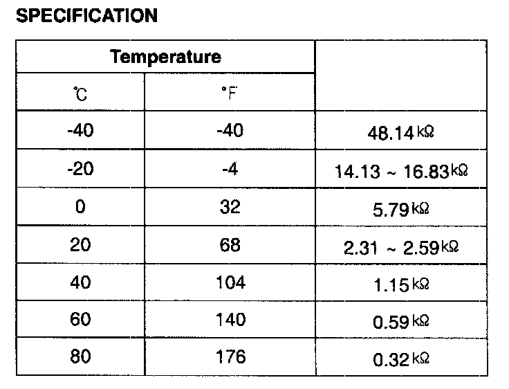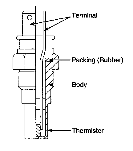 Engine Coolant Temperature Sensor (ECTS) is located in the engine coolant passage of the cylinder head for detecting the engine coolant temperature. The ECTS uses a thermistor whose resistance changes with the temperature. The electrical resistance of the ECTS decreases as the temperature increases, and increases as the temperature decreases. The reference 5 V in the PCM is supplied to the ECTS via a resistor in the PCM. That is, the resistor in the PCM and the thermistor in the ECTS are connected in series When the resistance value of the thermistor in the ECTS changes according to the engine coolant temperature, the output voltage also changes. During cold engine operation the PCM increases the fuel injection duration and controls the ignition timing using the information of engine coolant temperature to avoid engine stalling and improve driveablity.