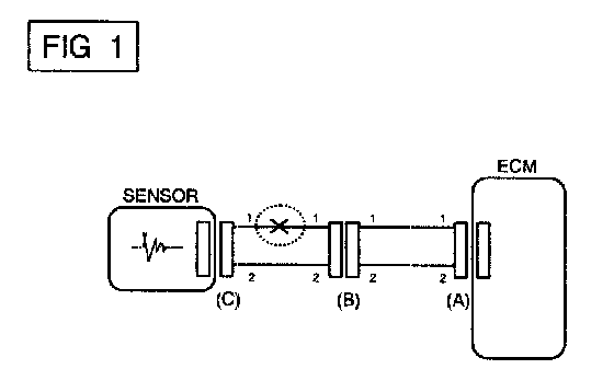 In [FIG.2.] the measured resistance of line 1 and 2 is higher than 1 Mohm and below 1 ohm respectively. Specifically the open circuit is line 1 (Line 2 is normal). To find exact break point, check sub line of line 1 as described in next step.