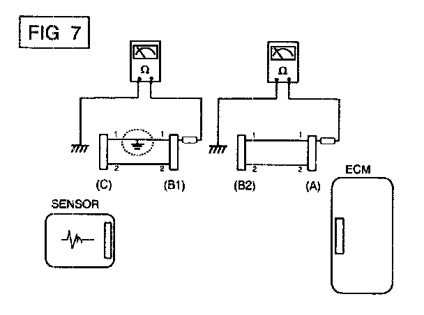b. Disconnect connector (B), and measure the resistance between connector (A) and chassis ground, and between (B1) and chassis ground as shown in [FIG. 7].