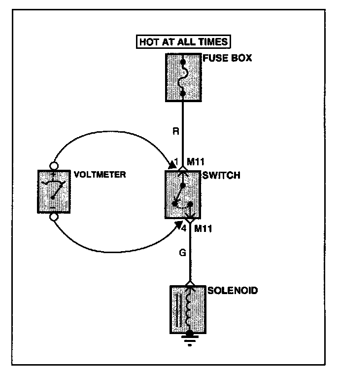 A. Connect one lead of a test lamp or voltmeter to a ground. If you are using a voltmeter, be sure it is the voltmeter's negative test lead you have connected to ground.