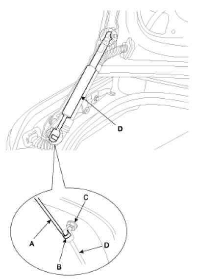 TRUNK LID LIFT REPLACEMENT1. Using a screwdriver (A), lift up slightly the socket clips (B) of both ends on the lifter (D), and then remove the lifter from the bracket (C).