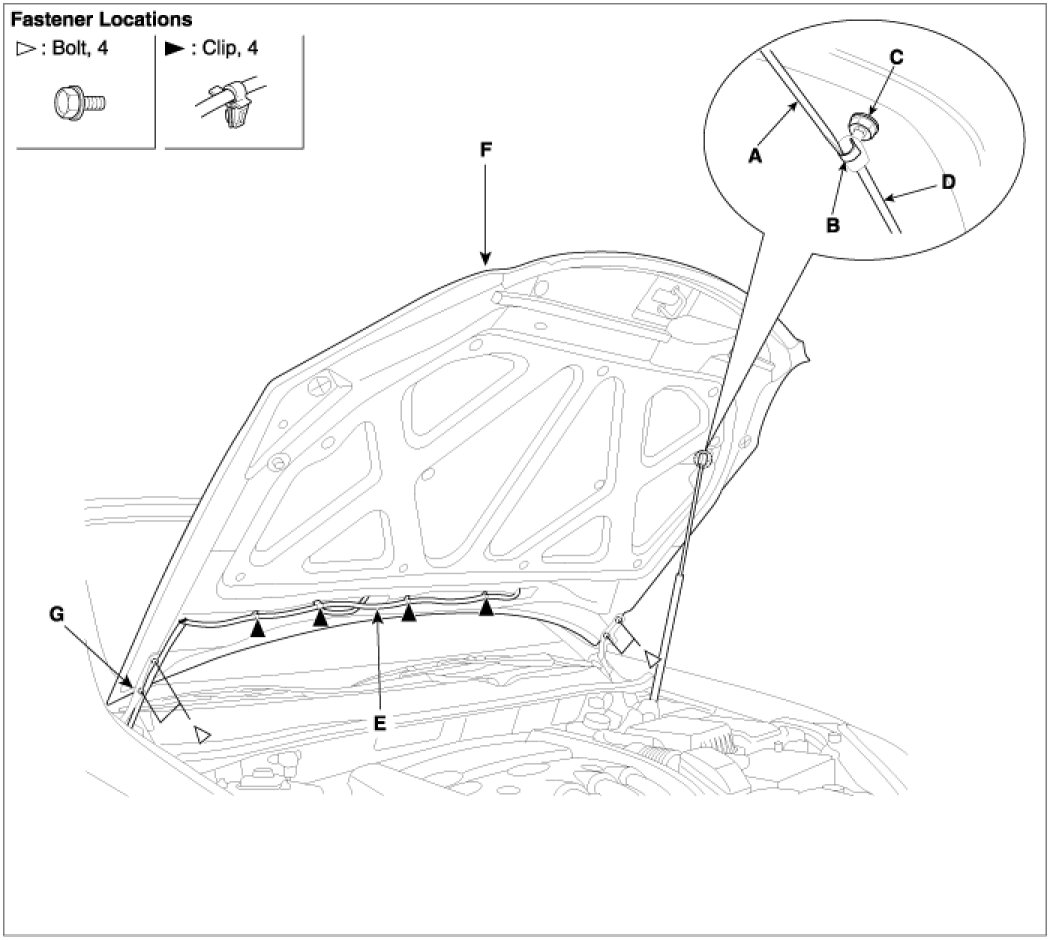 3. After loosen the hood hinge (G) mounting bolts, remove the hood (F).