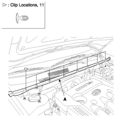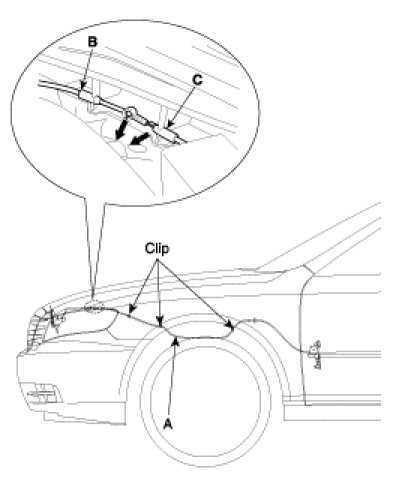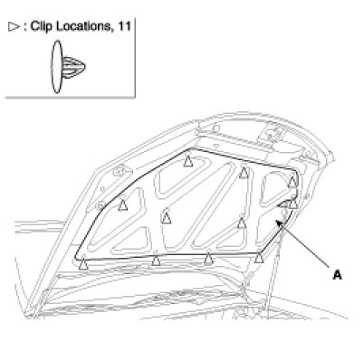 1. Detach the clips, then remove the hood weatherstrip(A).