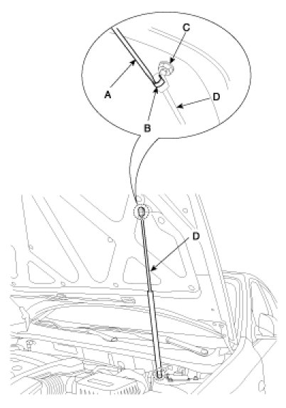 2. Disconnect the hood latch cable (B) and release cable (C).