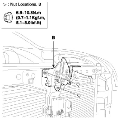 2. Disconnect the hood latch cable (B) from the hood release handle. Take care not to bend the cable.