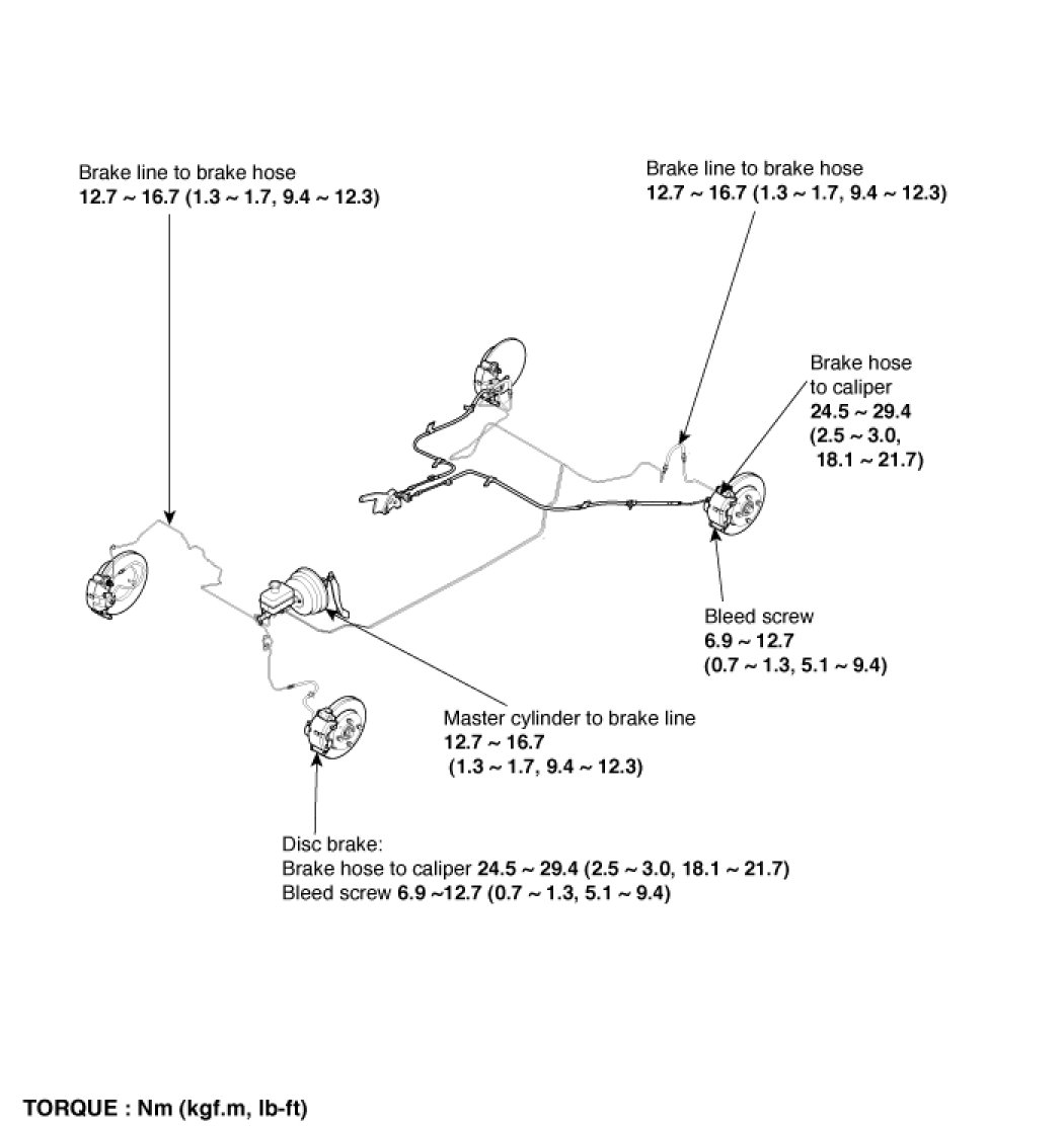 b. Check the brake hose and line joint for leaks, and tighten if necessary.