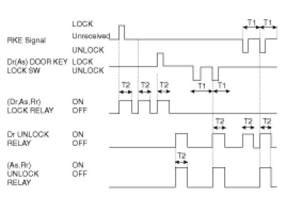 (2) Driver door unlock signal is output for T2 when RKE UNLOCK signal is received. But, all door unlock signals are output for T2 if RKE UNLOCK signal is received within T1.