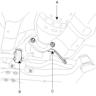 27. Supporting the cross member(A) with a jack, remove the stay(C) with the mounting bolts(B).
