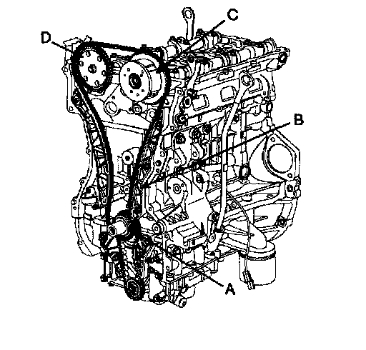 Crankshaft sprocket (A) -> Timing chain guide (B) Intake camshaft sprocket (C) -> Exhaust camshaft sprocket (D).