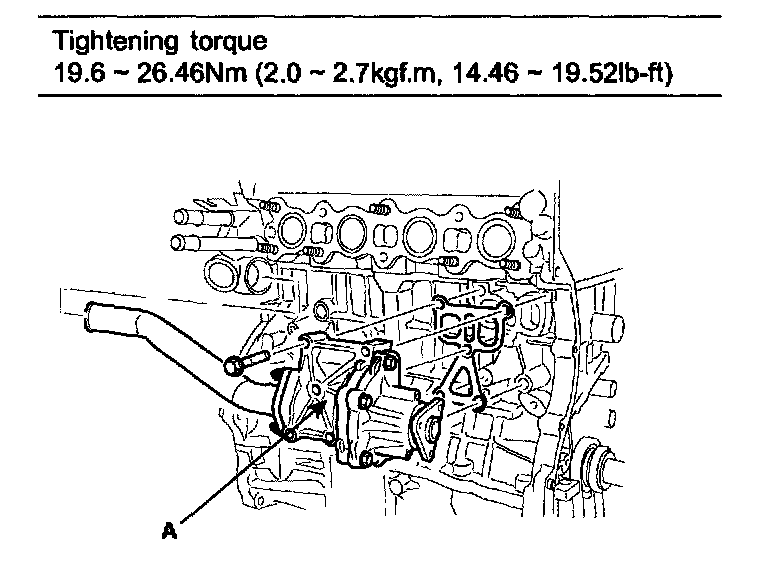 Install the water pump (A) and a new gasket with the 5 bolts.