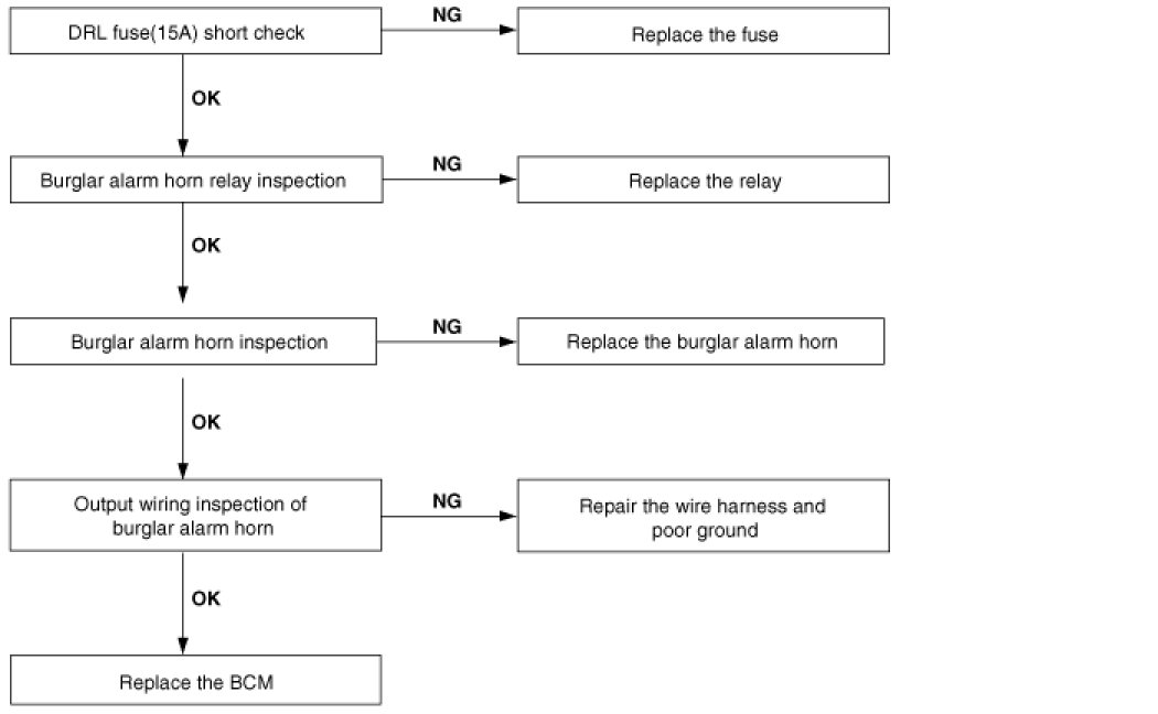 3. When door is opened inside the car, burglar horn does not work (If tailgate and hood is opened, alarm works)