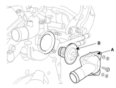 2. Remove the coolant inlet pitting(A) and the thermostat(B).