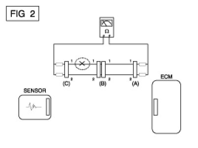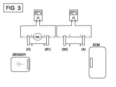 B. Disconnect connector (B), and measure for resistance between connector (C) and (B1) and between (B2) and (A) as shown in [FIG. 3].