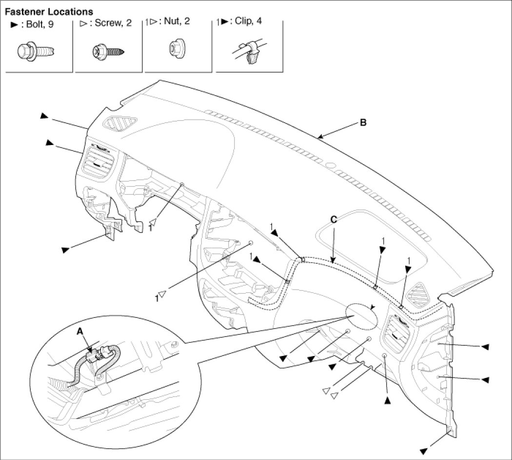3. Loosen the bolt`s and nuts then remove the main crash pad assemble(B).