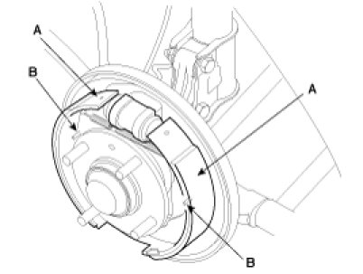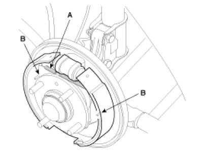 3. Lower the brake shoe assembly (A), and remove the lower return spring (B). Make sure not to damage the dust cover on the wheel cylinder.