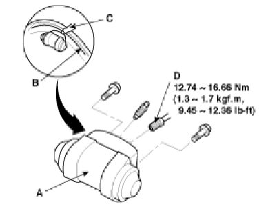 7. Remove the bolt (C) and the wheel cylinder(B) from the backing plate(D).