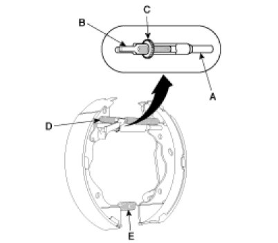 6. Install the adjuster assembly and upper return spring (D) as right direction. Be careful not to damage the wheel cylinder dust covers.