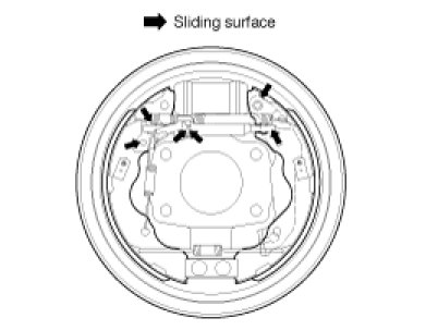 8. Apply brake cylinder grease or equivalent rubber grease to the sliding surfaces shown. Don't get grease on the brake linings.