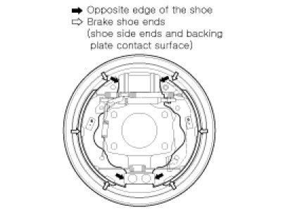 9. Apply brake cylinder grease or equivalent rubber grease to the brake shoe ends and opposite edges of the shoes shown. Don't get grease on the brake linings.