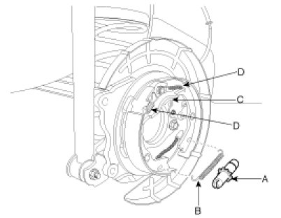 4. After installing the strut(C) and upper return spring(D), install the adjuster assembly(B) and the lower return spring(C).