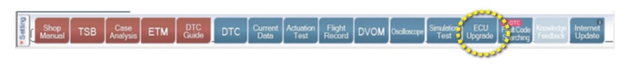 6. Once back at the GDS Main Screen, select ECU upgrade from the bottom right-hand corner. Next select Auto Mode, Engine. Perform the ECU upgrade in accordance with normal GDS tool ECU upgrade procedures.