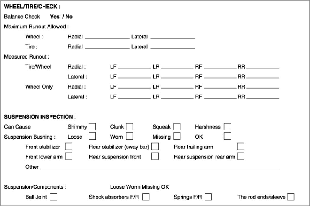 To assist the service advisor and the technician, check the suspension and wheel/tire condition with the questions listed below by filling them. It serves as a place to record information as well as data from the testing to be carried out. To begin a successful diagnosis, fill out the questions.