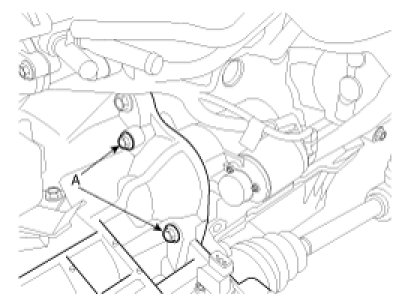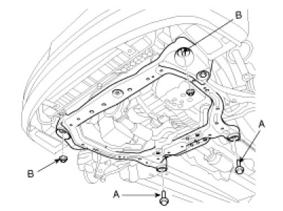 After removing the sub frame mounting bolts, the transaxle assembly may fall downward, and so support them securely with floor jack.