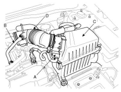 (2) Disconnect the air cleaner hose(D) from the bleeder hose(B).