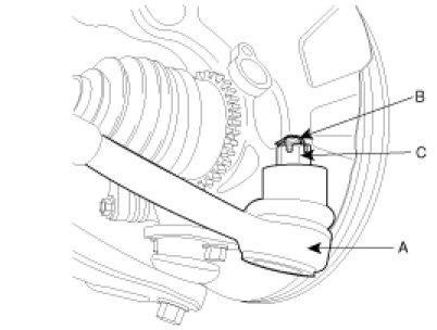 15. Remove the tie rod end(A) pin(B) and nut(C), then remove the tie rod end.