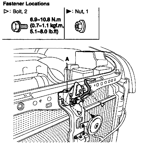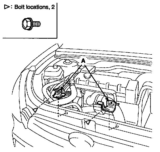 5. Remove the hood latch (A) mounting bolts.