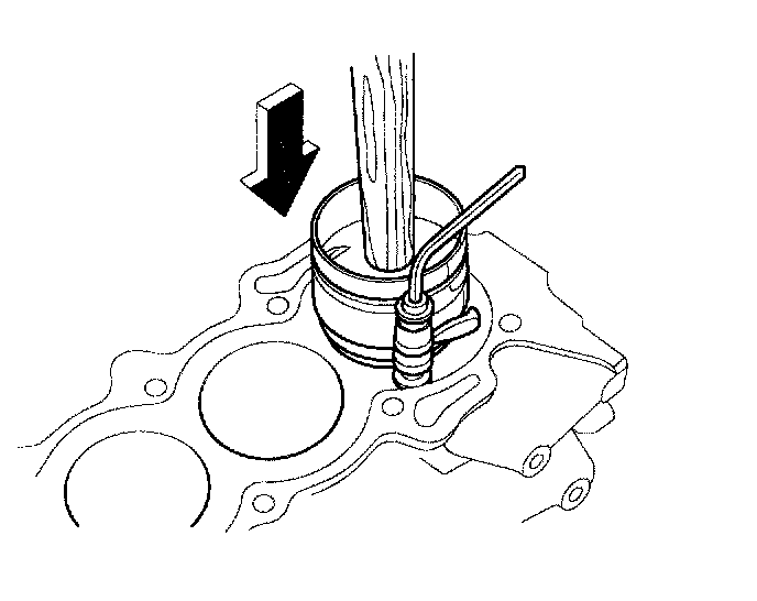 2) Install the ring compressor, check that the bearing is securely in place, then position the piston in the cylinder, and tap it in using the wooden handle of a hammer.