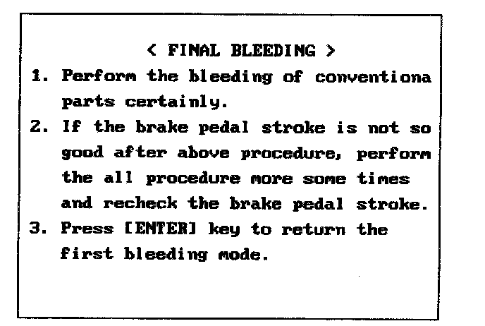 This procedure should be followed to ensure adequate bleeding of air and filling of the ABS unit, brake lines and master cylinder with brake fluid.